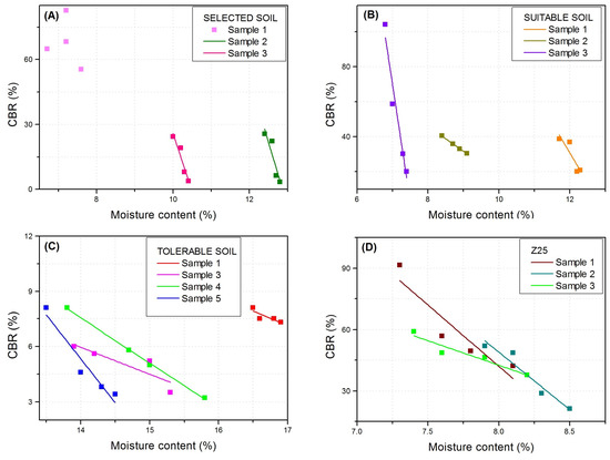 CBR versus moisture content for (A) selected soils, (B) suitable soils, (C) tolerable soils and (D) Z25 (artificial crushed graded soil).