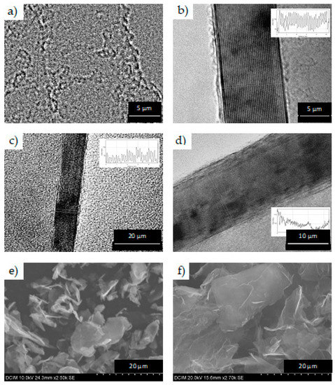 Figure 1 shows high resolution micrographs of the different types of the graphene nanoplatelets used in this work. It can be clearly seen that the thickest platelets are GNP4 and the thinnest ones are GNP1, according to the datasheets of the manufacturer (Table 1). Despite not showing a cross-section of GNP1, the fact that the thickness of GNP1 is the lowest of the four types is attributed to the lack of different contrast between the nanoplatelet and the background shown in Figure 1a, elucidating the low number of layers. The average lateral dimension is difficult to determine, but it is possible to observe that GNP2 nanoplatelets are smaller, while the largest ones are GNP4. Figure 2 shows the schematic morphology of each type of graphene nanoplatelet used in the study.