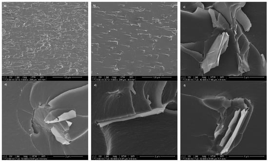 Figure 3 shows micrographs of the studied composites captured by FEG-SEM. These micrographs confirm a suitable dispersion degree for all the studied samples (Figure 3a,b) but also that high shear stirring could induce a wrinkling effect of the nanosheets [13]. This phenomenon seems to be more noticeable for composites reinforced with lower thickness GNPs (Figure 3c,d), while GNPs with higher thickness remain mostly stretched (Figure 3e,f). It is worthy to note that the percentage of GNPs added was the same one for all the samples. However, making a comparison between the micrographs (Figure 3a,b), it is possible to observe that the concentration of nanoplatelets, determined as the number of GNPs per observed area, is highest in the epoxy resin reinforced with GNP1. This concentration seems to decrease as the size of the nanoplatelets does. This is due to the different aspect ratios of the GNPs. GNP1 GNPs have the highest specific surface area and lowest thickness whereas GNP4 GNPs have specific surface area several orders of magnitude lower than GNP1 ones and higher thickness.