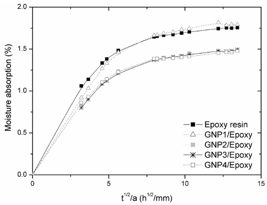 Moisture absorption of neat epoxy resin and epoxy composites reinforced with different types of graphene, commercially named GNP1, GNP2, GNP3 and GNP4, were t is time, and a is area.