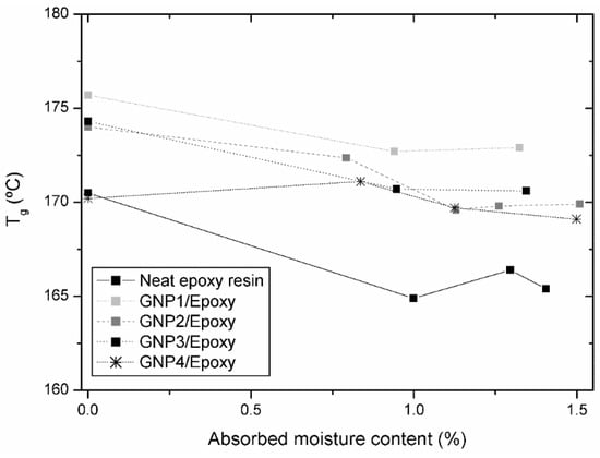 The Tg of neat epoxy resin decreases 3.6 °C per each 1% in weight of moisture absorbed while this effect decreases in composites up to 2.5 °C. This means that the addition of graphene nanoplatelets shows numerous advantages related to the hydrothermal resistance: Decreasing the absorbed water content and the consequences of its plasticization.