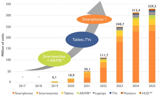 According to the Research and Markets, a market research institution, the global micro-LED display market is predicted to soar from USD 0.6 billion in 2019 to USD 20.5 billion in 2025, with a compound annual growth rate of about 80% []. The main reason for the market outbreak is the sharp increase in demand for brighter and more energy-efficient display panels, needed for surging devices such as smart watches, mobile phones, TVs, laptops, augmented reality (AR) and VR. According to Yole’s optimistic estimate, the market of micro-LED display will reach 330 million units by 2025 (Figure 1) []. Although the prospects of market are highly optimistic at present, micro-LED displays still face technological challenges, especially in the cases for which some key technologies and process equipment have not yet been made sufficiently developed. Therefore, the relatively mature mini-LED is expected to be the first commercialized variety while the micro-LED display technology is still in its nascent state.