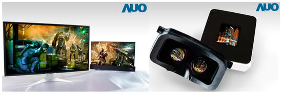 AU Optronics Corporation (AUO) demonstrated several high-end mini-LED backlit LCD displays, including a 27” 4K 144 Hz gaming monitor and a 1000 PPI 2” LTPS VR display (Figure 6) []. The gaming monitor used a straight down type mini-LED backlight to provide accurate local dimming with ultra-high brightness, creating a more realistic visual enjoyment for customer. However, the cost of mini-LEDs is still several times higher than traditional backlight technology at present. For head-mounted VR display, AUO shows a 2-inch panel equipped with an active matrix (AM) driver circuit which can achieve 1024 local dimming zones for vivid images.