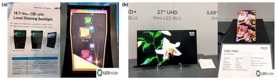 JDI, a Japanese manufacturer, demonstrated an automotive central control panel based on a 16.7 inch curved screen with a straight down type mini-LED backlight at 2018 SID Display Week, shown in Figure 7a []. The contrast and color of the screen can be presented perfectly even in complex situations because of the local dimming with 104 dimming zones in the screen. BOE, one of the largest display makers in China, exhibited a 27-inch ultra-high-definition (UHD) panel, which used a mini-LED backlight with 1000 local dimming zones. Its brightness is up to 600 nits and its contrast is up to 1,000,000:1. In addition, BOE also showed a 5.9-inch mobile phone panel which was only 1.4 mm in thickness, shown in Figure 7b [].