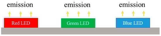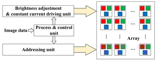 After that, a dedicated full-color driver chip is used to drive each color of micro-LEDs via the pulse width modulation (PWM) current. The PWM current drive method can achieve digital dimming by setting the duty cycle of the current. For example, an 8-bit PWM full-color driver chip can achieve 28 = 256 kinds of dimming effects of a single-color micro-LED, then for a pixel containing three-color LED theoretically can achieve 2563 = 16,777,216 kinds of dimming effect which means the same number of colors can be displayed. Figure 9 demonstrates the specific full-color display driving principle [].