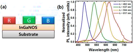 To address these issues, A. Even et al. developed an innovative substrate called InGaNOS (InGaN pseudo-substrates) that overcomes lattice mismatch []. The substrate has a top relaxed InGaN layer that can be used as a seed layer for full InGaN LED growth, as shown in Figure 10a. The experimental results illustrate that InGaN structures grown on InGaNOS substrates can span the spectrum from blue (482nm) to red (617nm) [], as shown in Figure 10b. InGaNOS technology can be used to create substrates with mixed lattice parameters, enabling growth of different color LEDs on the same substrate. This could drastically reduce the cost of micro-LED mass transfer for full-color display fabrication in the future.