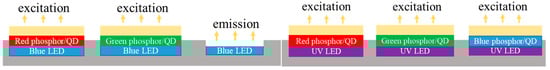 The full-color display can be achieved by employing excitation sources, such as ultraviolet (UV) micro-LED or blue micro-LED, with color-conversion materials. RGB color-conversion materials are needed to achieve RGB three primary colors if UV micro-LEDs are used, while only red and green color-conversion materials are required if blue micro-LEDs are used (Figure 11). Generally, color-conversion materials can be divided into the phosphor and the quantum dots (QDs).