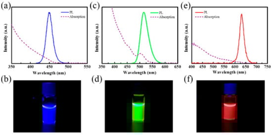Absorption and emission spectra of (a) blue, (c) green and (e) red QDs as well as solution photos of (b) blue, (d) green and (f) red QDs []. Figure reproduced with permission from Optical Society of America.