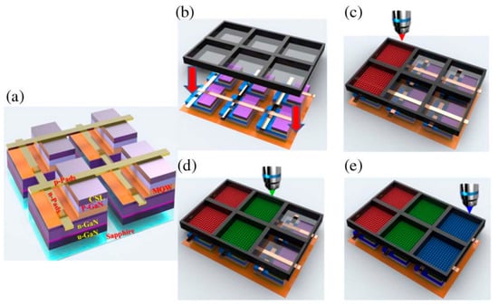 Process flow of the full-color micro-LED display. (a) The structure of the UV micro-LED array. (b) Aligning the PR mold to the micro-LED array. (c–e) Consequently jetting the RGB QDs inside the PR mold window to form full-color pixels []. Figure reproduced with permission from Optical Society of America.