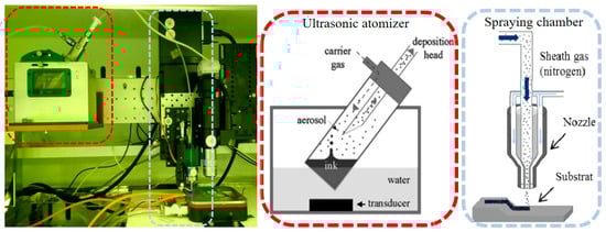 The AJ system consists primarily of an ultrasonic atomizer and a spraying chamber (Figure 15). Inside the ultrasonic atomizer, ultrasonic vibrations first atomize the RGB QD suspension. Then, a nitrogen gas flow transfers the AJ to the nozzle to becoming small drops. Ultimately, QDs are deposited on the substrate with high resolution and narrow linewidth.