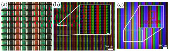 Combining UV micro-LEDs and RGB QDs together, Prof. Kuo et al. demonstrated a method to achieve full-color high-quality micro-LED displays via the aerosol jet (AJ) technique [,]. Additionally, a photoresist (PR) mold is fabricated to limit the optical cross-talk effect, and the QDs are deposited into the PR mold with clear separation between each other. Furthermore, a distributed Bragg reflector (DBR) covered above the PR mold can significantly enhance both the utilization of UV light and the emission intensity of RGB QDs.