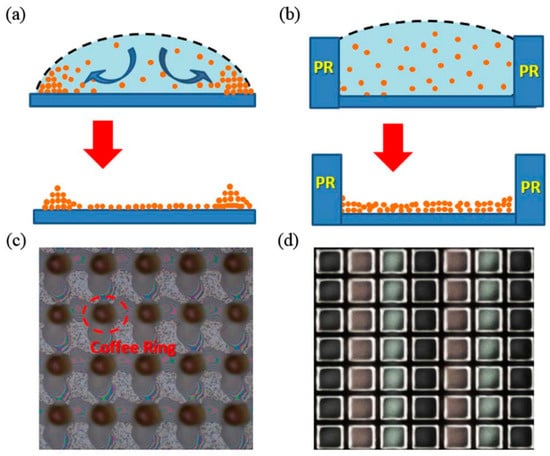 (a) Principle of the coffee ring effect. (b) Principle of reducing the coffee ring effect via the PR mold. (c) The coffee ring effect can be observed without the PR mold. (d)The PR mold confines the QD drops and resolve the coffee ring effect []. Figure reproduced with permission from Optical Society of America.
