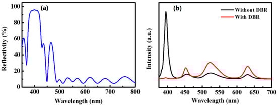 (a) Measured reflectance spectrum of the DBR. (b) The emission spectra with and without the DBR structure []. Figure reproduced with permission from Optical Society of America.