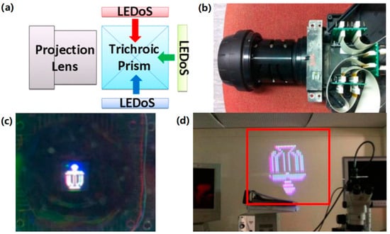 - Chong, W.C.; Wong, K.M.; Liu, Z.J.; Lau, K.M. A novel full-color 3LED projection system using R-G-B light emitting diodes on silicon (LEDoS) micro-displays. In SID Symposium Digest of Technical Papers; Wiley Online Library: Hoboken, NJ, USA, 2013; Volume 44, pp. 838–841. [Google Scholar]