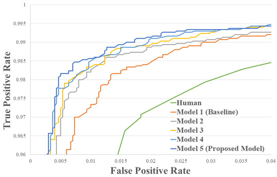 In the second experiment, we compared the performance of the baseline model and PSI-CNN using our dataset generated from CCTVs. This dataset has around 1,500 images of 10 individuals, comprising both high-quality images of frontal faces and low-resolution CCTV images for each person. The number of genuine and imposter pairs are 2380 and 21,420 respectively. This CCTV dataset was only used for the testing phase to demonstrate PSI-CNN’s robustness towards variations in image resolutions and qualities. For performance comparisons, we used the equal error rate (EER), which defines the error rate at which the false acceptance rate (FAR) and the false rejection rate (FRR) are equal. FAR and FRR are calculated using (4) and (5) respectively. In these equations, true positive (TP) and false negative (TN) refer to cases whereby the model identifies a true match as positive and negative respectively, and vice versa for true negative (TN) and false positive(FP).