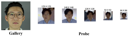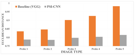 Additionally, we sampled and classified some CCTV images into groups (Probe 1 to probe 5) according to their facial region size (see Figure 4 for a comprehensive example). In each group of these sampled images, we compared the average matching distance achieved by the baseline and PSI-CNN models. As shown in Figure 5, the proposed model achieves small error distance between the reference frontal image and low-resolution CCTV images even when the resolution of the query image is significantly reduced. This demonstrates PSI-CNN’s robustness to unfavorable changes in image resolution and quality.