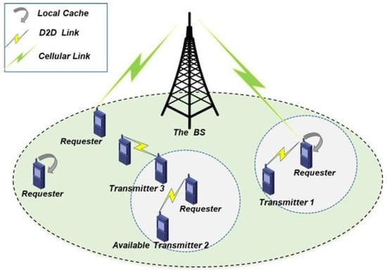 Caching has been emphasized as an efficient technique for offloading data traffic by storing content at the network edge (e.g., in base stations (BSs) or devices), handling wireless access requests directly, rather than fetching content from the core network []. The quest for a suitable caching strategy, cooperative content offloading prevents redundancies in user demands and reduces duplicate content transmissions [,]. Upon receiving a request for content, a device obtains the requested content from the local storage if the content is locally cached; otherwise, it obtains the content from devices through device-to-device (D2D) communication. If there is no device nearby, a BS handles the requested content. By caching content based on popularity in BSs with high storage capacities, the traffic load in the core network is reduced considerably []. It is worth noting that devices with the desired cached content are not always available for content retrieval, owing to user uncertainty (e.g., storage capacity constraints, resource constraints and limitations to battery consumption) and this can reduce the service quality.