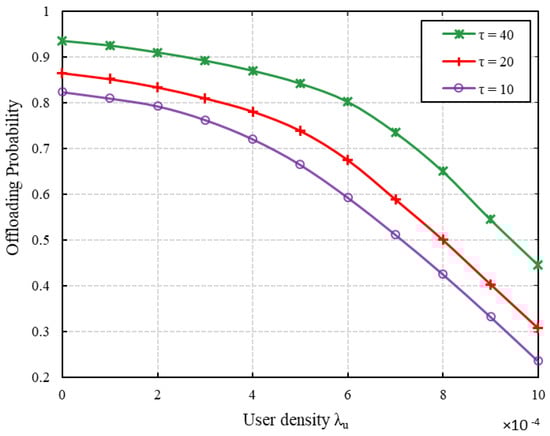 In Figure 2, we compare the offloading probability with different values of the required sending time . As shown in this figure, with the growth of user density , the offloading probability decreases because the increase in density of device transmitters facilitates more simultaneous cache-aided transmission links, leading to increased interference among links. We also observe that when the user density is low, the offloading probability increases as the sending time increases. This result is consistent with our expectations. Given a longer sending time, the users have a greater chance of transmitting the desired content but as the user density increases, the increased number of potential device transmitters leads to increased interference. Thus, the offloading probability decreases. This implies that is the main factor that has an impact on offloading traffic.