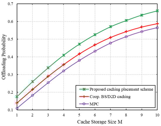 We compare the offloading probabilities among the three different cache placement schemes by varying the cache storage size with the size of contents as shown in Figure 5. We can see that the performances of all three schemes increase with an increase in the cache storage size, which provides the scope to cache more contents. Moreover, the offloading probability increases more with the proposed scheme compared to the other schemes, particularly with larger cache sizes. The offloading probability of the proposed scheme from 1 to 10 of the cache storage size improves averagely 13.5% and 23% than the Coop. BS/D2D caching and the MPC schemes, respectively. These results indicate that the proposed cache placement scheme leads to the highest reduction in content redundancy, which accordingly leads to the greatest increase in the cache capacity of the whole network to store more popular content. Further, that is a significant gain given the large volume of offloading content delivery traffic.