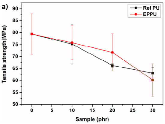 In addition, the properties of the prepared polyurethanes as a toughener were studied by adding them to epoxy compositions composed of an epoxy resin and a curing agent: dicy. The epoxy compositions include various amounts of PU, except for EPPU-2 because it has a high viscosity; it was cured as described previously to prepare the test specimens for the measurements of the mechanical and thermal properties. Figure 8a shows that epoxy compositions with synthetic EPPU had higher tensile strengths than those of the epoxy compositions with Ref PU. Furthermore, epoxy compositions containing EPPU have higher flexural strength than epoxy compositions containing Ref PU (Figure 8b). This indicates that the rigid EPPU in the epoxy compositions compensated for the flexibility of the overall PU and enhanced the mechanical strength. In addition, the impact resistance of the epoxy binder with 10 phr of EPPU increased by ~17% compared to that of neat epoxy (Figure 8c). However, when more than 10 phr of EPPU was included in the epoxy compositions, the impact resistance became lower than that of the epoxy with Ref PU due to the increased rigidity from aromatic groups in EPPU [21].
