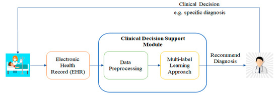 Clinical decision support systems—of which diagnosis decision support system is a representative example—are developed to assist clinicians in making accurate clinical decision using informatics tools and machine leaning techniques [9]. Boosting approaches [10], support vector machines (SVMs) [11], deep learning [12] and rule-based methods [13] have been applied in clinical decision support systems for detecting specific diseases. However, multi-label learning approaches are rarely applied in clinical decision support systems. One example where this type of learning approach was used was in Wang et al. [6]. Using electronic health record data and applying the multi-label learning approach, the authors of that paper developed a shared decision-making system for recommending diabetes medication.