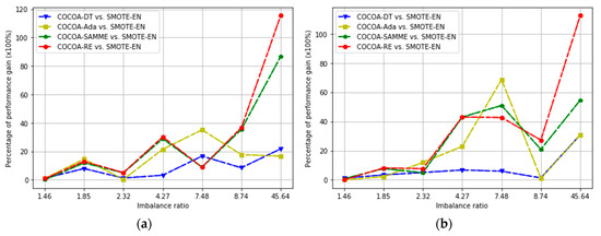 Percentage of performance gain between each algorithm based Cross-Coupling Aggregation (COCOA) and SMOTE-EN () changes along imbalance ratio of the class label : (a) the changes of performance gains based on F-measure when the binary classifier is decision tree; (b) the changes of performance gains based on F-measure when the binary classifier is neural network. SMOTE-EN: an ensemble version of synthetic minority over-sampling technique.