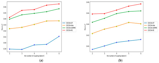 Comparative Macro-F values with changing coupling labels: (a) the Macro-F values of different when the binary classifier is decision tree; (b) the Macro-F values of different when the binary classifier is neural network.