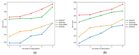 To further investigate the performance of COCOA-RE in different numbers of coupling labels , experiments were carried out in which was changed from 2 to 6. When Macro-F was chosen to evaluate the performance, the relative results against four comparable algorithms in which the binary classifier was decision tree is depicted in Figure 3a and that against four comparable algorithms in which the binary classifier was neural network is depicted in Figure 3b. When Macro-AUC was chosen to evaluate the performance, the relative results against four comparable algorithms in which the binary classifier was decision tree is depicted in Figure 4a and that against four comparable algorithms in which the binary classifier was neural network is depicted in Figure 4b. As shown in Figure 3 and Figure 4, COCOA-RE maintained the best performance against the comparable algorithms across different whether the evaluation metric was Macro-F or Macro-AUC. Furthermore, the COCOA-RE achieved the best Macro-F value and best Macro-AUC when the number of coupling labels was 6. These results indicate that the COCOA-RE that considers correlations between more coupling labels would achieve better performance.