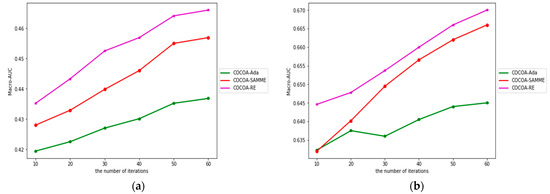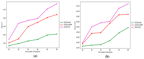 It is necessary to consider the number of iterations when employing ensemble learning approaches. COCOA-Ada integrated with the ensemble algorithm named Adaboost.M1 as the multi-class classifier and COCOA-SAMME integrated with the ensemble algorithm named SAMME as the multi-class classifier were chosen to make comparisons with COCOA-RE. Using decision tree as the binary-class classifier, the Macro-F values and Macro-AUC values of comparable approaches in different iterations is shown in Figure 5a,b. Figure 6a,b present the Macro-F values and Macro-AUC values of comparable approaches in different iterations using neural network as the binary-class classifier. From these results, it can be seen that irrespective of the binary classifier chosen, COCOA-RE outperformed comparable approaches. Moreover, the Macro-F value and Macro-AUC value in COCOA-RE increased with the growth of iterations, but the rate of the increase of Macro-F value and that of Macro-AUC began slowing down when the number of iterations was higher than 50. This indicates that the performance of COCOA-RE would be improved by increasing the number of iterations. However, increasing the iterations implies that more weak classifiers are required to be trained, which would enhance the burden of computing cost. Thus, the number of iterations should not be set too large in order to avoid heavy computational cost.