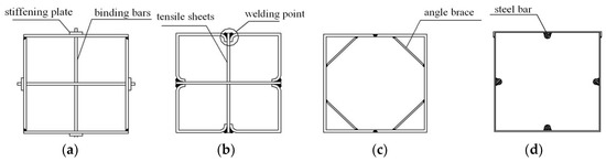 The specimen plan is shown in Table 1. There are two thin-walled CFST columns with steel-bar stiffeners inside the tube, two thin-walled CFST columns with steel-bar stiffeners outside the tube, one thin-walled CFST column without any stiffeners inside, and one steel tubular column without concrete and stiffeners inside the tube. The section details of the specimens are shown in Figure 3.