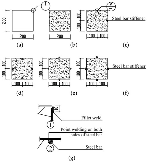The square thin-walled steel tube was made of two parts, including a U-shaped steel plate and a flat steel plate. The square steel tube was formed by welding those two parts together. The welding method is shown in Figure 3g.