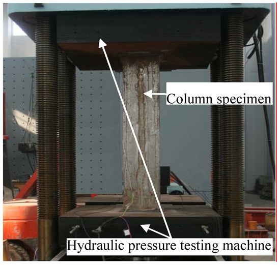 Static-loading experiments were conducted using a 5000 kN hydraulic pressure-testing machine, which is shown in Figure 4. The static pressure load was applied onto the column specimens step by step. At the beginning, each load step was 1/10 of the ultimate load of the column, and then adjusted to 1/20 of the ultimate load of the column when close to the ultimate load. The load and displacement of column top were detected by the data-collection system and recorded in a computer. With the load being applied step by step, the relationship of load and longitudinal displacement was planned by the computer, which could be used to monitor the experimental process and determine the yield-load and ultimate-load values.