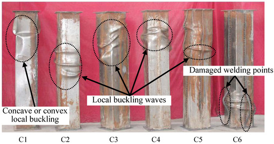 The failure modes of all the specimens are shown in Figure 5. For column C1, with no concrete inside the steel tube, concave local buckling of the steel plate occurred in one side of the square steel tube and convex local buckling of the steel plate occurred in the opposite side.
