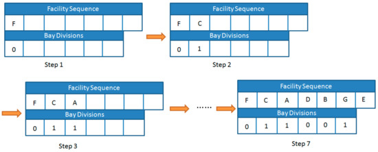 There are four bays in this example: Bay 1, Bay 2, Bay 3, and Bay 4. Each bay contains one or more facilities. For instance, Bay 1 contains two facilities, F and C, while Bay 2 contains only one facility, A. To represent the layout shown in Figure 1 by using FSB encoding, two arrays are required, as shown in Figure 2. The first array, facility sequence, describes the ordering of the facilities from top to bottom and from left to right in the layout. The second array, bay divisions, indicates whether the corresponding facility is the last one in one bay or not. Since the top left facility is F, it is the first one placed into the two arrays, as shown the first step in Figure 2. Moreover, because it is not the last one in the first bay, the corresponding element is set to 0. That is, the first element in the array of bay divisions is set to 0. Next, the second facility, C, is inserted into the arrays because it is in Bay 1 and below Facility F, as shown in Step 2 in Figure 2. Since it is the last one in Bay 1, its value in the second element in the array of bay division is set to 1. At Step 3, we move to Facility A in Bay 2. Because Facility A is also the last one in Bay 2, the third element in Bay Divisions is set to 1. Totally, seven steps are needed for processing seven facilities. Note that the seventh element in the bay divisions array is omitted because Facility E is the last one in the facility sequence.
