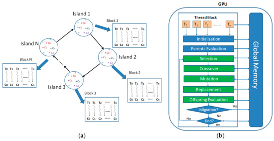 - Melab, N.; Talbi, E.G. GPU-based island model for evolutionary algorithms. In Proceedings of the 12th annual conference on Genetic and evolutionary computation, Porland, OR, USA, 7–11 July 2010; ACM: New York, NY, USA, 2010. [Google Scholar]