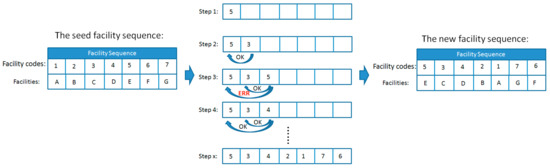 To generate facility sequences randomly, the conventional method (INI_FS1) is usually adopted, i.e., if there are p facilities, p random numbers are generated and any two numbers cannot be identical. An example to illustrate INI_FS1 is shown in Figure 4. Assume there are seven facilities, and they are represented by letters, A to G, respectively. Actually, each letter is associated with a code, e.g., 1 to 7 for A to G. Initially, we need a facility sequence to generate different facility sequences from it, which is called the seed facility sequence. The seed facility sequence is set according to alphabetical order, as shown on the left side of Figure 4. To generate a new individual of the facility sequence, Step 1 is to produce one random integer number, 5 in this example. Then at Step 2, the second random integer number, 3, is produced. In order to avoid generating two identical facilities, we have to compare the newly generated facility with all previous ones at every step. Therefore, at Step 2, the second number, 3, is compared with the first number, 5, and we conclude that 3 can be kept. Next, at Step 3 the number 5 is produced, however, it is identical to the first number in the sequence. Therefore, the newly generated facility with number 5 should be abandoned and regeneration of the third number is required. At Step 4, the code number 4 is randomly produced, which can be accepted through comparing it with the preceding numbers. Repetition of random number generation and duplication avoidance like above steps, finally a new facility sequence is generated, as shown on the right-hand side of Figure 4. In this method, a large number of comparisons are required, making the complexity of the algorithm equal to O(p2). Therefore, our improved method (INI_FS2) is proposed below to eliminate comparisons and also to avoid regeneration of random numbers for the same array element.