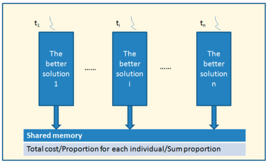 However, because one chromosome consists of many genes, to increase the parallelism, we propose an enhanced method that uses one thread to deal with one gene, instead of one chromosome, to improve the migrated performance (MIG_G). In the case of UA-FLP, p (p ≥ 7) facilities—encoded with a gene for each facility—are combined into an individual that represents one facility sequence. Assume that two random individuals are selected for migration, there will be 2p threads responsible for the migration. If the number of facilities is large and the migration rate is high, then our method can use more threads to process migration concurrently, which can save more time than the previous method. Figure 12 shows the procedures of how to apply one thread to process one gene in the migration step. The pseudocode of MIG_G is shown in Kernel Algorithm 5.