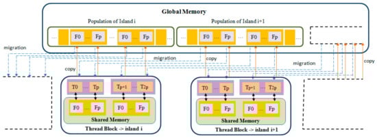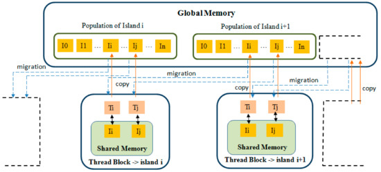 Figure 3 illustrates the structure of our parallel IMGA on GPU. The main implementation structure is shown in Figure 3a. There are N islands organized as ring topology, which have n/N chromosomes on each of them. The entire algorithm is executed on GPU with one block per island. The total population of individuals is stored in global memory which is the largest in terms of size. For each block, a group of threads execute standard GA in parallel. Figure 3b gives an illustration of one particular island on GPU. Threads on each block are responsible for executing the procedures of IMGA including initialization, evaluation, selection, crossover, mutation, replacement, and migration operators. Regarding the migration, communications are carried out through the global memory which stores global population, resulting in each island being able to communicate with each other according to our ring topology.