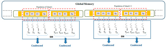 The reason why using each thread to process a gene is better than using the thread to process a chromosome is because we not only take full advantage of the fine-grained parallelism, but also utilize memory coalescing to access global memory in our improved migration algorithm. Accessing data in global memory is critical to the performance of a CUDA application since read and write operations are slow in global memory that is comprised of dynamic random-access memories (DRAMs). A parallel process of modern DRAMs is that for each time when a location is accessed, many consecutive locations including the requested location are accessed. Therefore, only in this way of parallel accessing can DRAMs work close to the advertised peak global memory bandwidth if an application uses data from consecutive locations. Figure 14 shows the memory coalescing of our MIG_G. When all threads in a warp execute a same instruction to read the migrated genes, the hardware detects whether the threads access consecutive memory locations in global memory. Because the genes of a chromosome are stored in an array with consecutive locations in global memory, the hardware coalesces all memory accesses into one consolidated access to these consecutive DRAM locations. While in the preliminary algorithm MIG_I, one thread migrates one chromosome. Although each chromosome is adjacent to each other, a stride exists between them as there are many genes in each chromosome. In a CUDA GPU, the threads in a same warp will access genes at the same place in their responsible chromosomes. For instance, if one thread access to the first gene, the other threads in the same warp will also access to their first gene in their responsible chromosomes simultaneously. However, the first genes are not consecutive. When all the threads in a warp execute a read operation to the chromosomes in global memory, usually more than one memory access transaction is required, resulting in a performance worse than that with memory coalescing, like our proposed algorithm. The complexity of MIG_I is O(p) as each thread must move the genes sequentially, while the complexity of MIG_G is O(1) because one thread moves one gene.