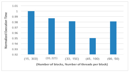 Comparison of normalized execution time for various combinations of number of blocks and number of threads per block. The number of blocks is equal to the number of islands. The number of threads per block is equal to the product of the number of chromosomes and the number of genes per chromosome. In this comparison, five chromosomes are migrated per island.