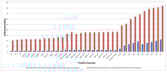 We compare the performance improvements executed on the CPU and GPU for all 34 data sets, as shown in Figure 17, which indicates the performance ratios of our improved GPU version over the CPU version and the performance ratios of the previous GPU version over the CPU version. Note that the data sets are listed in ascending order based on the number of facilities. The previous GPU version outperforms the CPU one for all the data sets. The best performance ratio is up to 20. On the other hand, our GPU version provides much better performance for all cases, with the performance ratio over the CPU version up to 84. Comparing the performance ratios provided by two versions of GPU, our GPU version is much better, meaning the better parallelization methods we suggest for IMGA steps really contribute to performance improvement. Moreover, when the number of facilities is increased, the performance of our GPU version is also highly improved.