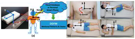 The procedure of data collection is shown in (a). The changes in human posture will be detected using the tri-axial gravitational sensor and the collected data will then be transmitted to a personal cloud database. The longest dimension of the sensor is about 4 cm and its weight is about 7 g. (b) Shows the related location of the sensor that was directly adhered on a subject’s chest. The directions of sensing axes of the G-sensor were also depicted in each photo of various postures. (c–e) Respectively exhibit the analyzed postures from lying face-up, to turning left, and to turning right. Eventually, the posture recognition would be achieved using the proposed data density functional method (DDFM).