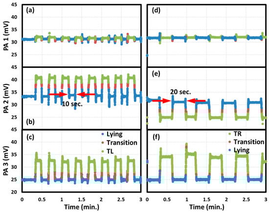 Five healthy subjects, three females and two males, were recruited in this studied case to simulate the expected human motional patterns. The average age of these subjects is 22.8 years old with a standard deviation of 1.92 years old, and the average height is 161.8 cm with a standard deviation of 7.43 cm. Since the collected signals from the subjects were highly similar, one dataset of signals from a subject was randomly employed in the following study. Figure 3 depicts the original time-dependent signals collected by the tri-axial G-sensor in each corresponding sensing axis. Each numbered principal axis (PA) is correspondent to each sensing axis. In the proposed experimental scheme, two different periodic times, 20 and 40 s, were adopted and the motions were repeated eight times within three minutes. The different periodic times between these studying cases were deliberately arranged in the experiments in order to check the immunity of DDFM from the different experimental circumstances. The signals shown from Figure 3a–c sequentially describe the repeated motional patterns from lying face-up to turning left (TL) in each PA and that from (d)–(f) shows the patterns from lying to turning right (TR), respectively. By considering the hardware architecture shown in Figure 1, the direction of PA 1 was the same as the rotating axis of the subject body so that the signal variation in PA 1 was much weaker than that in both PA 2 and PA 3 in each studied case. The waveforms of PA 3 shown in Figure 3c,f are similar and they also have similar signal levels in the lying states. On the contrary, the directions of waveforms of PA 2 shown in Figure 3b,e are opposite, even though they also have similar signal levels in the lying states. These sequential variations of motional patterns in PA 2 and PA 3 caused by the architecture of the G-sensor constitute the feasible features of the motional pattern recognition in the study and may be used to compensate for the lack of sensor number. Thus, these features were used as the prior information in the DDFM algorithm.