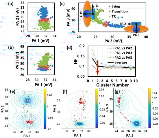 To introduce the DDFM to the time-dependent signal analysis, the datasets were first mapped into 2D pseudo-physical spaces as shown in Figure 4 and Figure 5. Figure 4 and Figure 5 respectively exhibit the classified results of motional patterns of Lying-to-TL and Lying-to-TR states. By comparing these classified results, it is obvious that the difference in the periodic times employed in the experiments would not substantially affect the accuracy of the DDFM algorithm. Meanwhile, the overshooting signals depicted in Figure 3 also only offered insignificant noise levels. As expected, the scattered plots of Figure 4a,b exhibit the ignorable motional patterns in PA 1, whereas that of Figure 4c reveals significant physical couplings between body motions and the rotating directions of the G-sensor. Additionally, according to Steps (6)–(9) in the proposed algorithmic flow, the most probable cluster number and the corresponding cluster boundaries could be well defined by estimating the systematic global Hamiltonian functional and the energy characteristics of LDF morphologies, respectively. The data PDFs in the 2D pseudo-physical spaces were statistically estimated using the GMM method associated with the expectation-maximization (EM) algorithm, and the corresponding trend curves of the global Hamiltonian functional were also delineated in Figure 4d and Figure 5d. The average global Hamiltonian functional was then used to track the most probable cluster number, and the characteristic factor was set to be ε = 0.02HF[n]i−1 in each case. As indicated by the red arrows in the plots, the most probable cluster numbers in these studied cases all pointed to cluster number two, as expected. It is also noted that the fluctuations that occurred behind the most probable numbers were caused by non-ideal effects []. For instance, the GMM-EM algorithm cannot exactly catch the main locations of clusters in the studied cases, as shown in Figure 4f. Additionally, the chaotic changes of human posture also cause non-ideal covariance matrices of data PDFs so that the irregular data distributions increase the estimation errors of the EM algorithm.