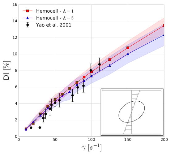46] consists of positioning an RBC in Couette shear flow such that the axis of symmetry lies in the shear plane and is perpendicular to the flow velocity. We numerically replicate this experiment with shear rate values between 10 and 200 s