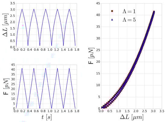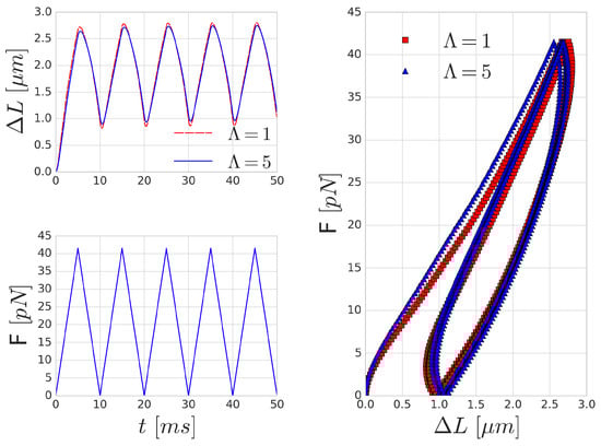 52] since they prescribed the movement and inferred the forces from the deformation of the beads. In our case, the magnitude of the stretching force is prescribed and we measure the deformation versus time. A similar hysteresis loop is present, as can be seen in the right side of