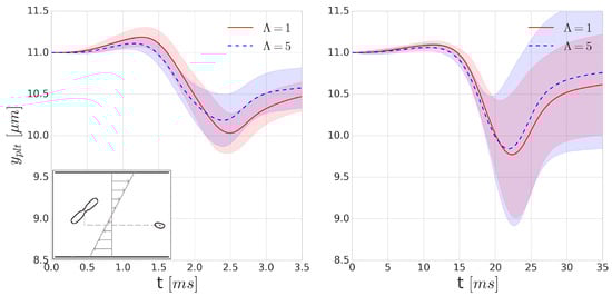 Since collisions typically happen on a ms time-scale, they might be significantly influenced by the increase of inner cytoplasmic viscosity. To investigate the effects of such viscosity contrast on platelet trajectories during a collision, we positioned a RBC and platelet 16 m apart in Couette flow where the distance between the centre points of the particles perpendicular to the shear plane (denoted y direction) is m. Each of the simulations is performed with and without the cytoplasmic viscosity contrast for the internal fluid of the RBC at shear rates of 400 s and 4000 s. As the orientation angle of the RBC and platelet can vary in blood flow, we performed each simulation 16 times, varying the starting orientation of the platelet and the RBC with respect to each other in each simulation to sample the possible orientations, after which the results of these simulations were averaged.