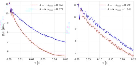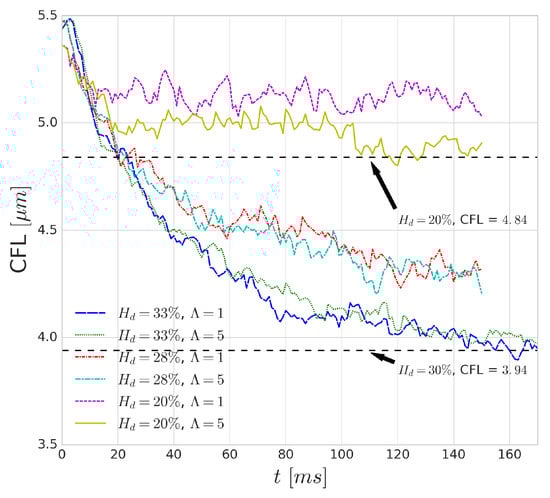 Figure 14 shows the effect of increased cytoplasmic viscosity on the width of the CFL, as well as on its development over time. The dashed black lines indicate values from the validation of HemoCell library [