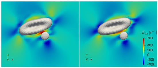 Figure 10, we depict the largest elongational component of the rate of strain tensor during a collision with and without increased cytoplasmic viscosity at the bulk shear rate of 1000 s