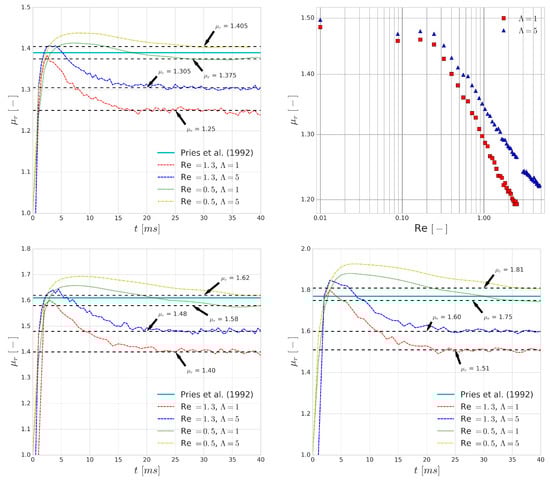 Figure 12 shows a qualitatively good agreement with the experimental results. Please note that the saturation of the relative apparent viscosity for higher Reynolds numbers is not reached in these simulations due to the numerical limitations that arise as the Reynolds number passes a certain threshold. This threshold is Re > 2.5 if